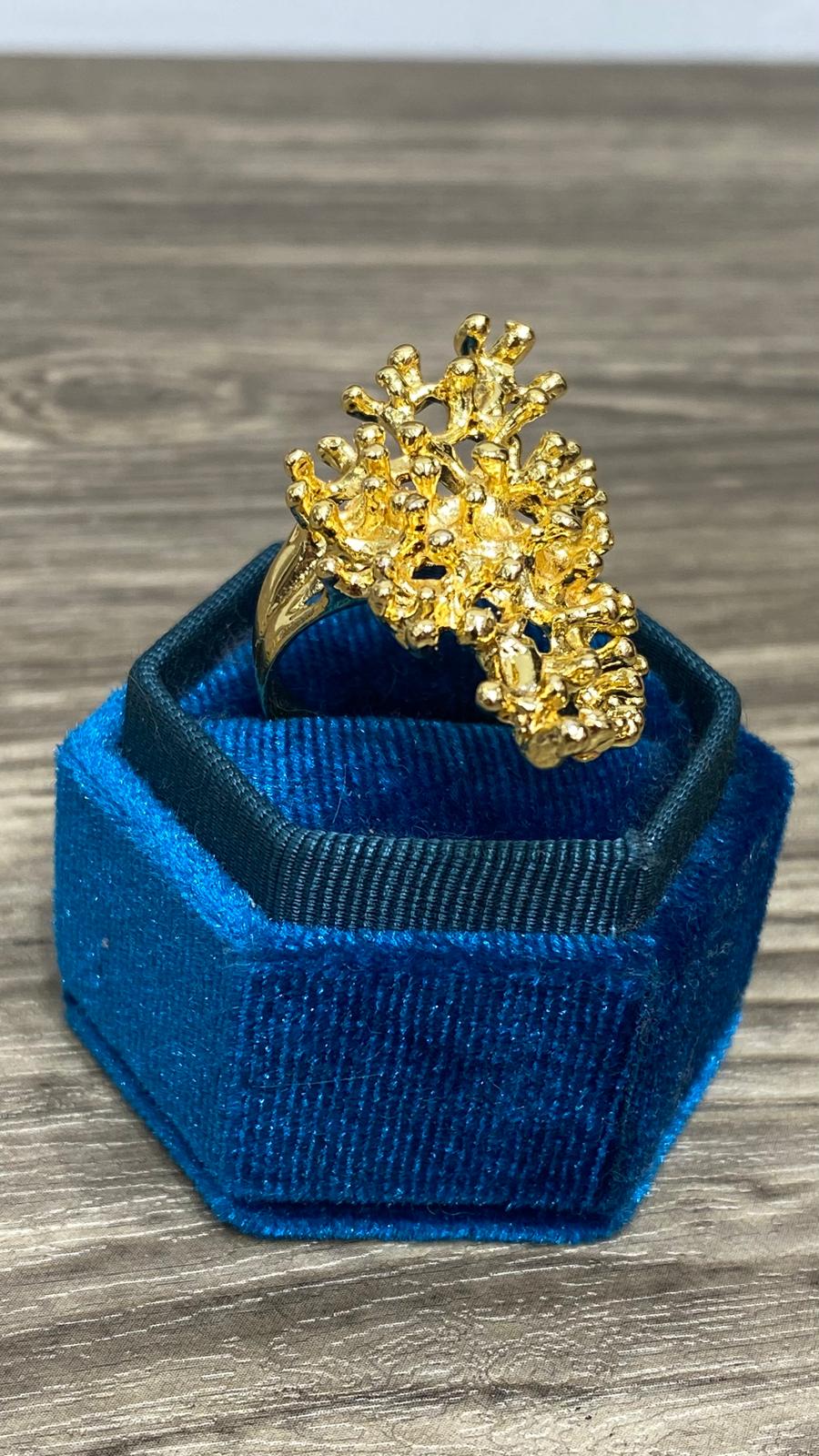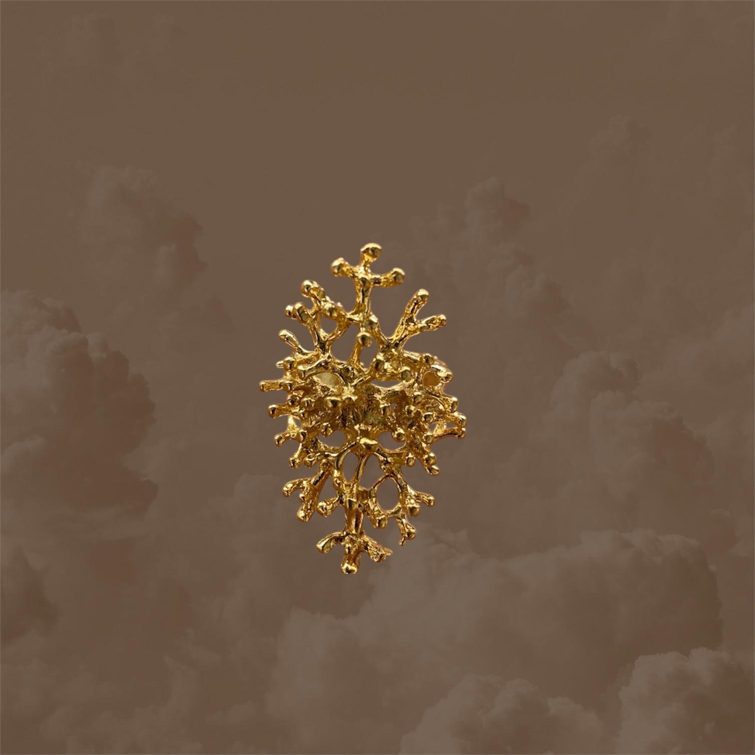 Anillo escultorico de bronce con baño de oro, inspirado en las formas vivas de los corales marinos. Su estructura ramificada y asimetrica recuerda una joya natural surgida del fondo del mar. La superficie texturizada refleja la luz con un brillo cálido y organico, destacando su caracter único y artesanal.