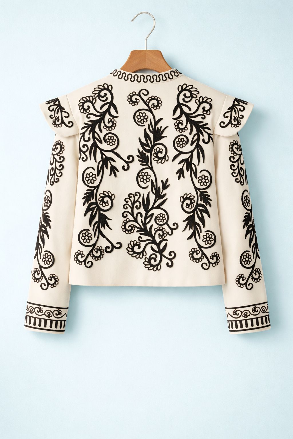 Preciosa chaqueta corta tipo torera bordada con dibujos florales negros. Su especial cuello mao y hombreras hace de esta prenda un imprescindible para esta temporada.