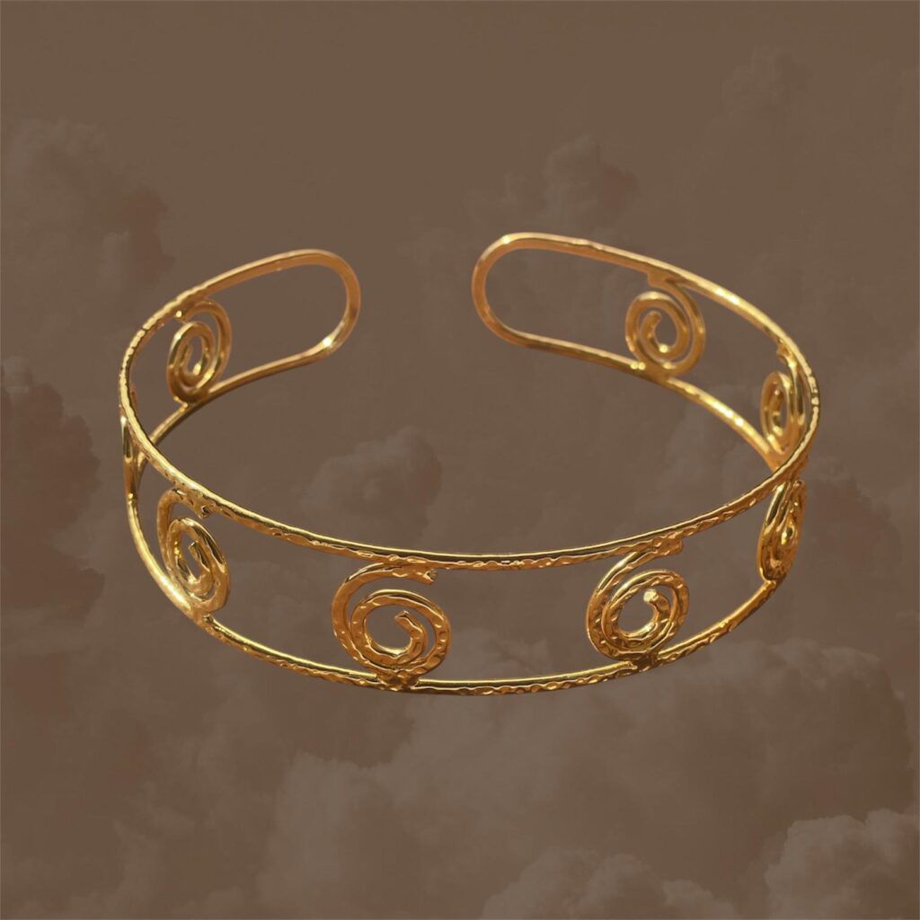 Esta gargantilla dorada con espirales forjadas representa el eterno movimiento del sol y la energía cíclica de la vida. Una pieza que combina fuerza simbólica y elegancia artesanal, ideal para mujeres con presencia magnética.