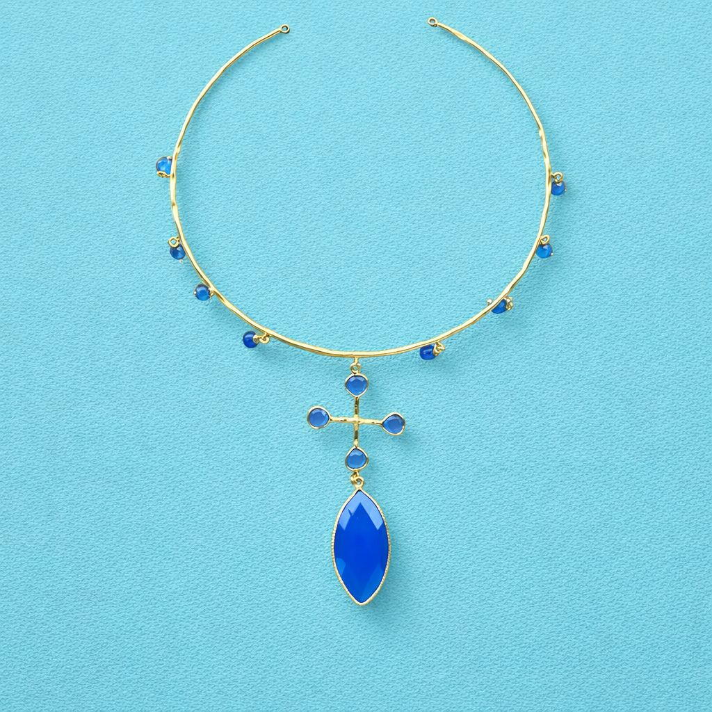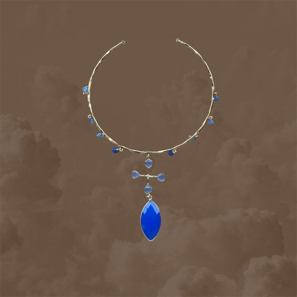 El nombre de Ischia evoca el encanto del Mediterráneo profundo. Este collar rígido o choker combina piedras azules en forma de cruz con una pieza central en talla marquise que cae como una gota luminosa. Un diseño elegante y etéreo que fusiona tradición, y modernidad con un aire místico y femenino.