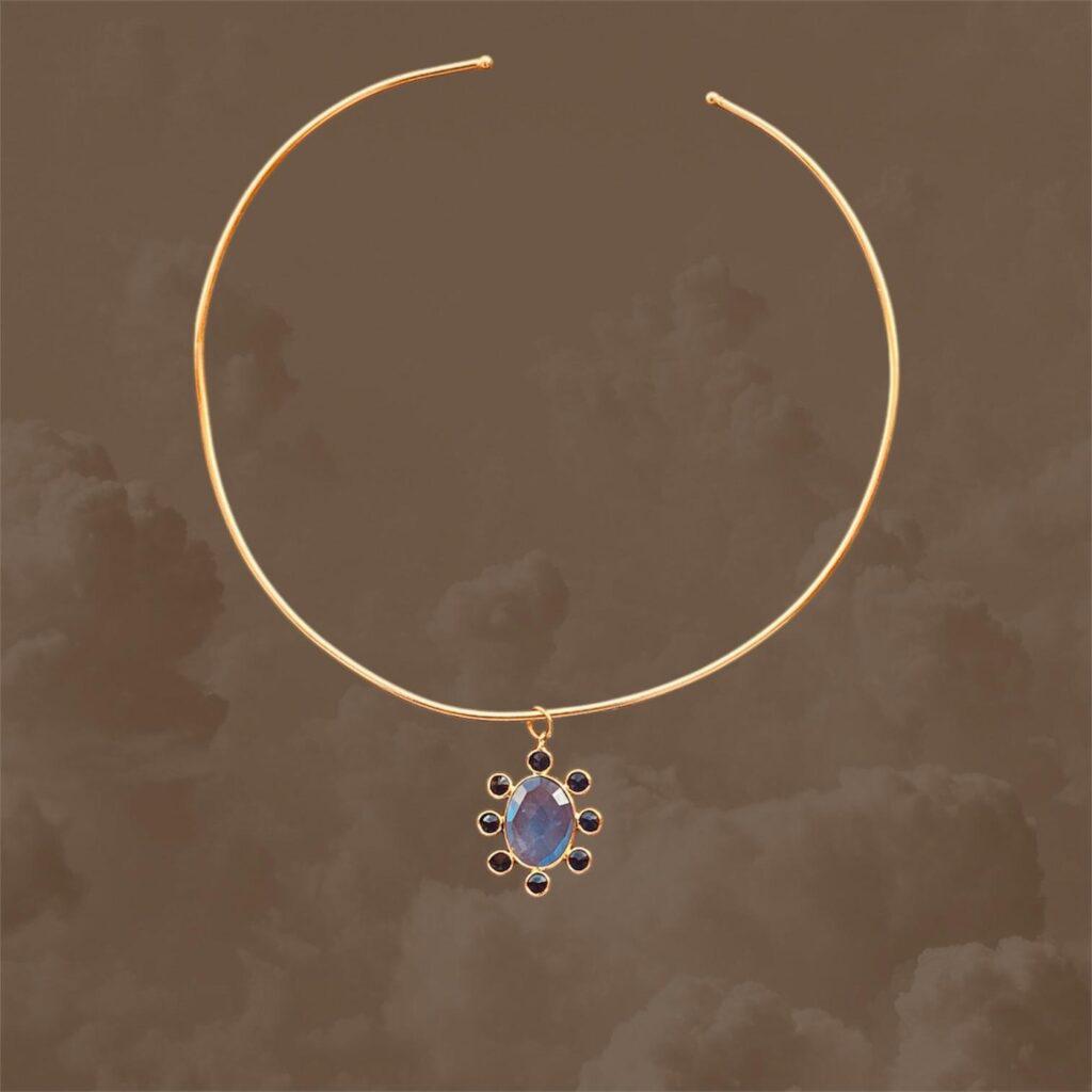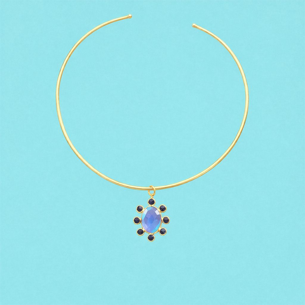 El nombre de Tánger que lleva este collar es tributo a su piedra azul intenso, que recuerda el brillo del profundo mar al atardecer. Rodeada por pequeños círculos dorados, esta joya rígida tiene un aire de misterio y luz, como la ciudad marroquí que inspira. Un diseño que queda fenomenal para llevarla con un vaquero y una camisa blanca.
