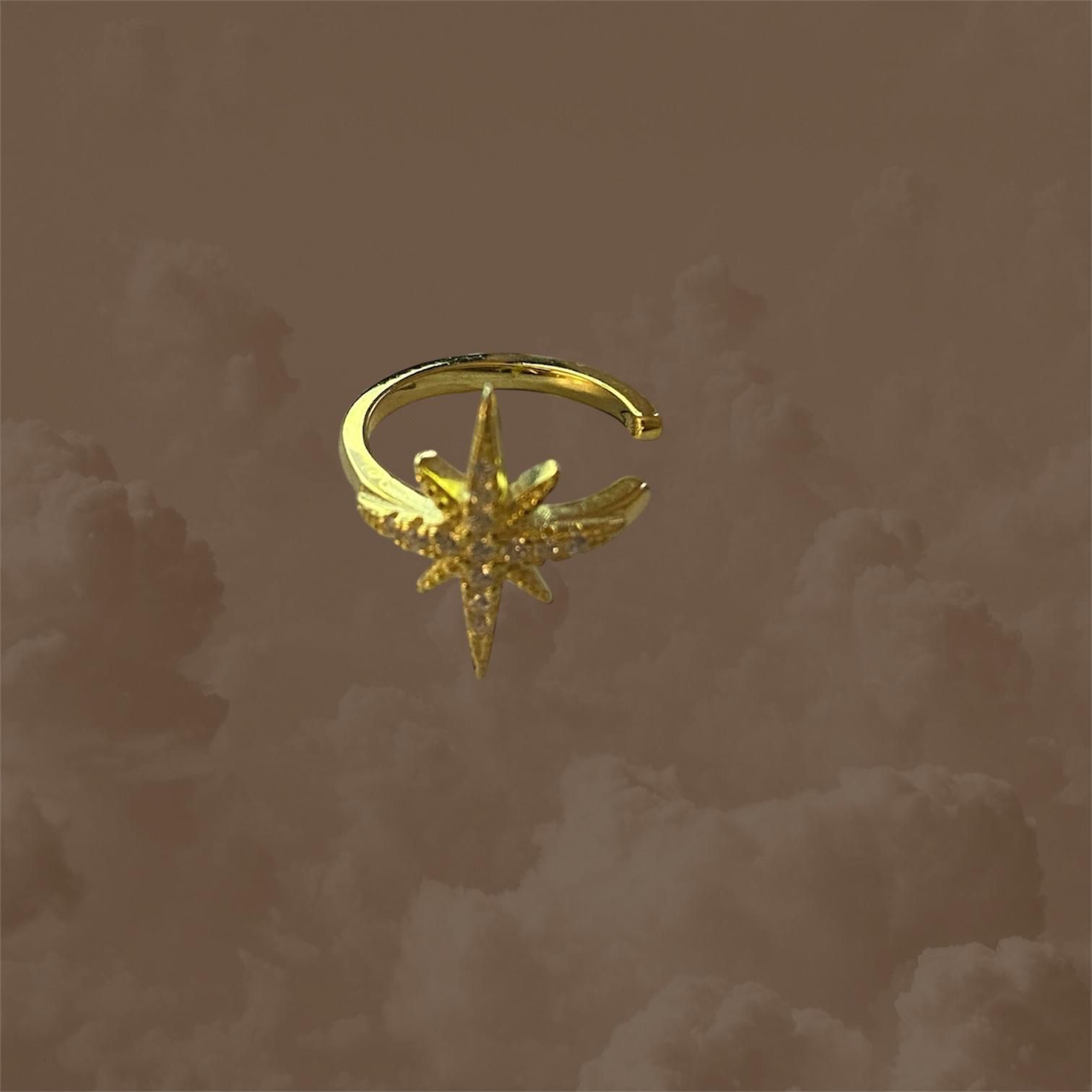 Ear cuff en baño de oro en forma de estrella asimétrica . Esta adornada con micro incrustaciones brillantes que capturan la luz en cada segundo, aportando un toque divino y moderno a cualquier look.