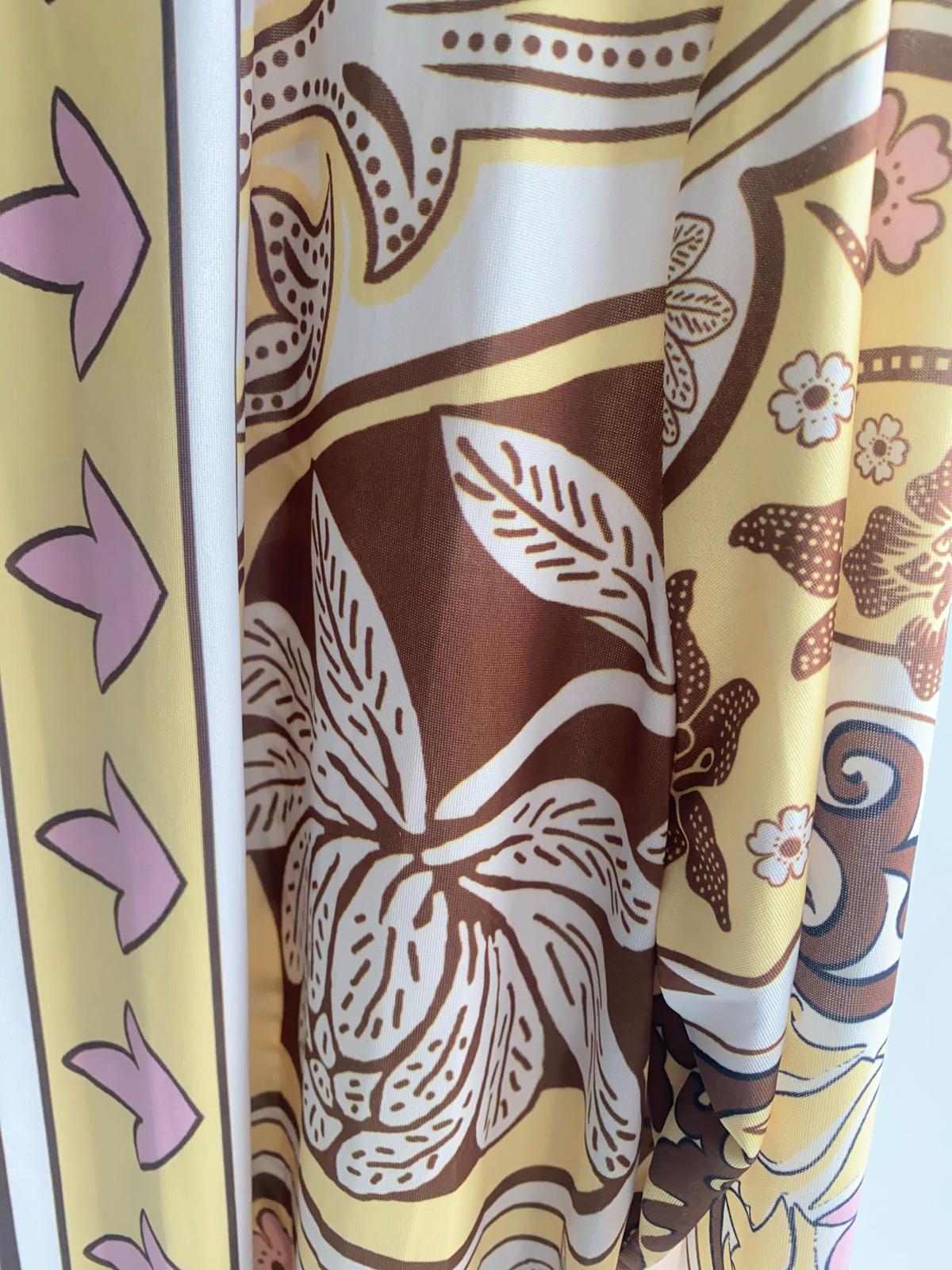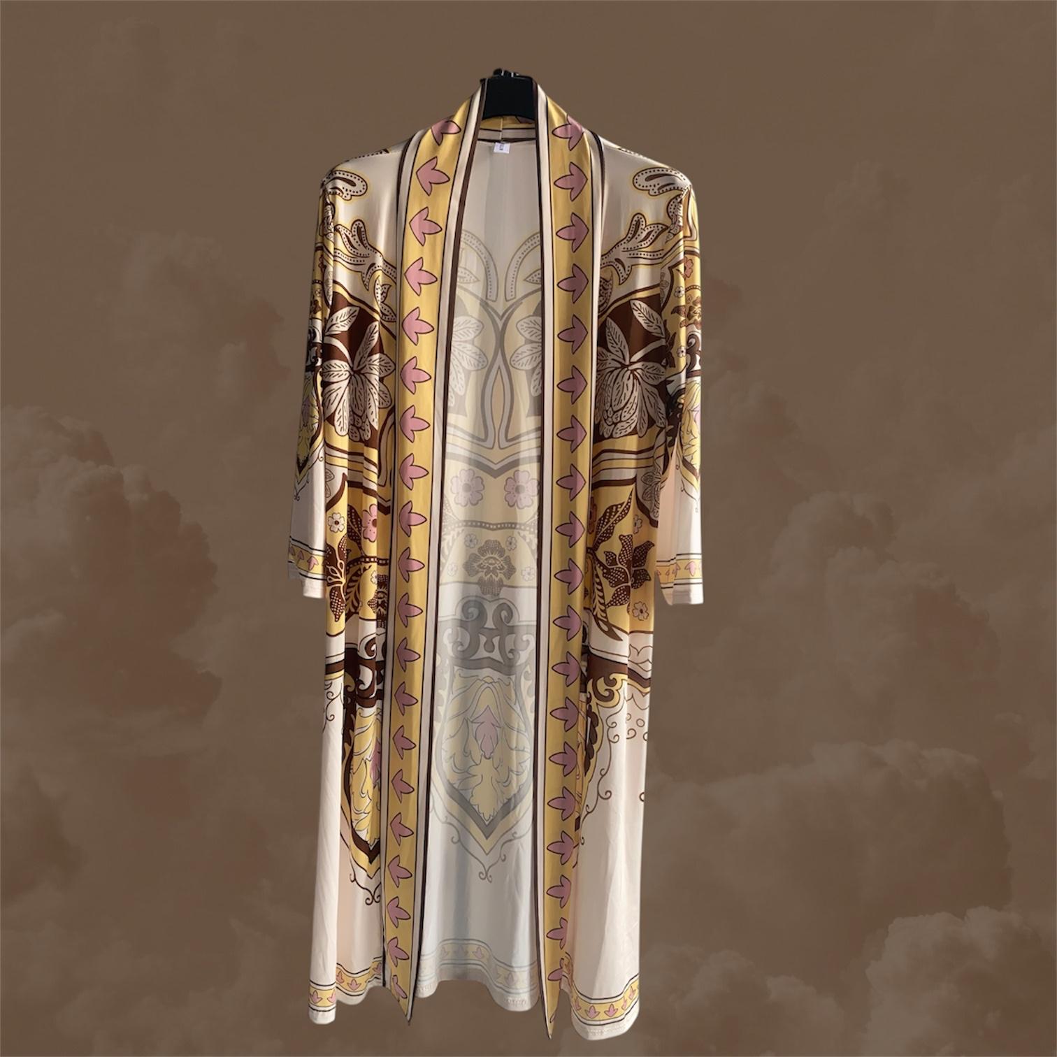Kimono a la altura por debajo de la rodilla de inspiración oriental, confeccionado en poliéster satinado con caída fluida. Su estampado ornamental en tonos cálidos, amarillo, marrón y detalles en rosa empolvado evoca jardines botánicos y arquitectura clásica. Perfecto como sobre camisa elegante para realzar con cualquier pantalón blanco o un vaquero.