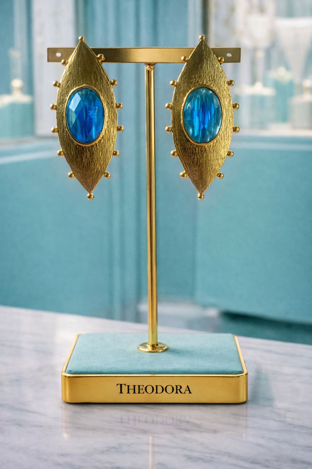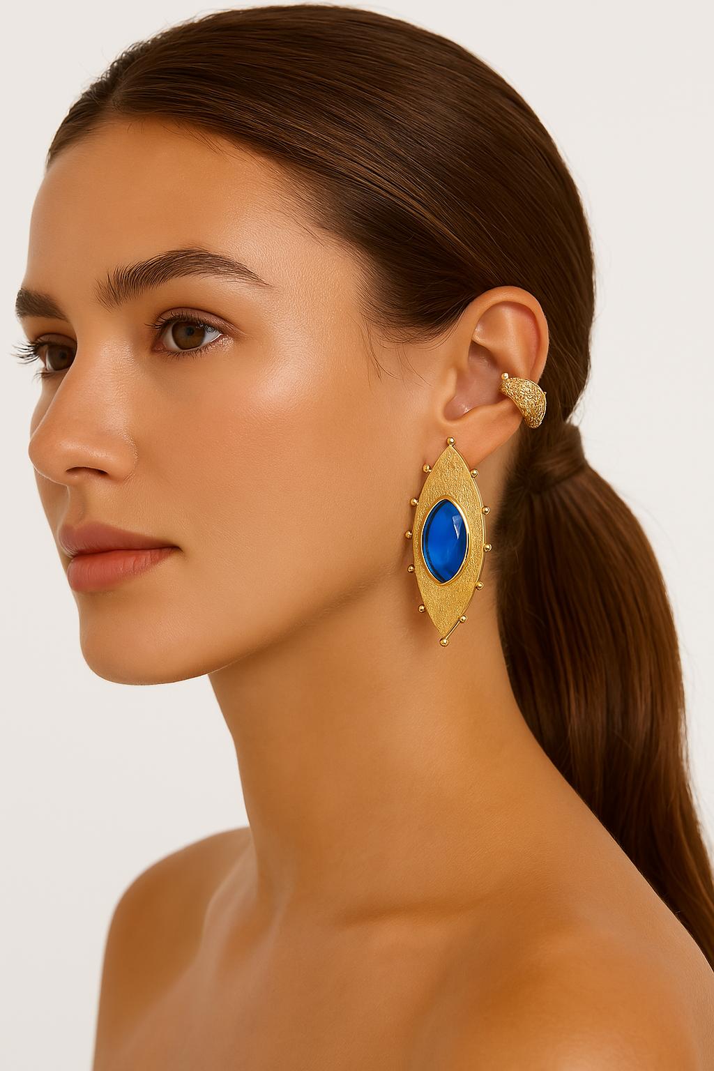 Diseño llamativo con un toque de fantasía. Los pendientes Índigo están hechos en bronce con baño de oro, y presentan una piedra azul facetada en el centro que capta la luz con intensidad. La forma afilada y alargada, rematada con pequeñas esferas doradas, crea una silueta moderna con carácter. Perfectos para destacar y elevar cualquier look con un punto de color vibrante.