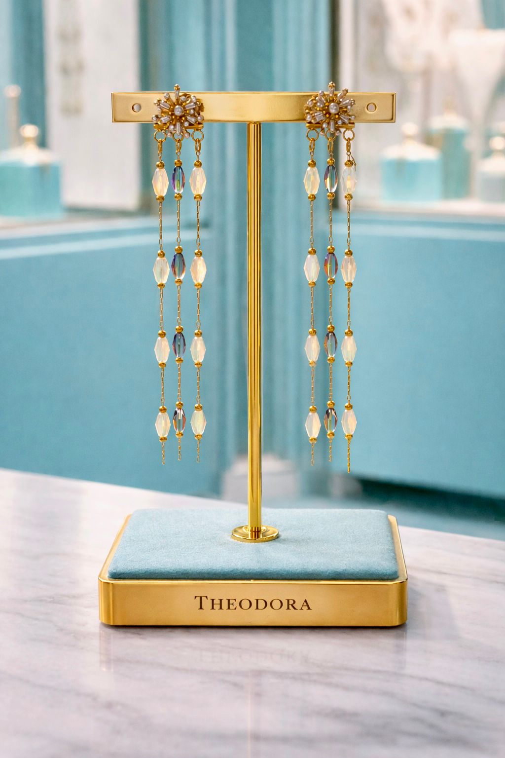 Los pendientes Riviera, son una oda al feminismo y elegancia. Elaborados por una flor con pequeñas perlas y tres hilos de cuentas de cristal que capturan la luz en cada movimiento. Su diseño aporta luminosidad al rosto y combina elegancia y sofisticación en cualquier look