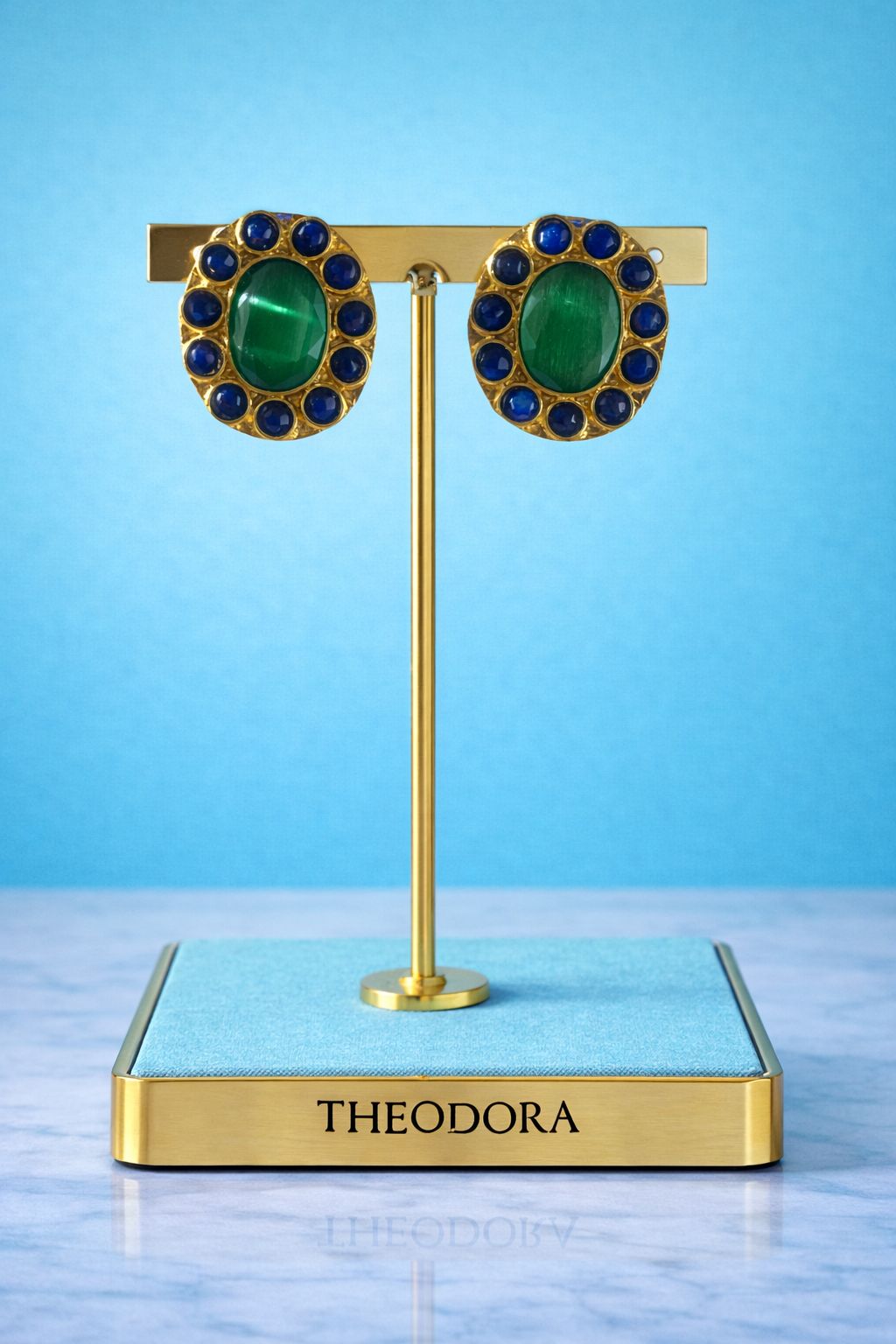 Pendientes de bronce con baño de oro y piedra central verde enmarcada por piedras azules que aportan profundidad y carácter . Un diseño con aire de joya antigua, sofisticado y poderoso, pensado para iluminar el rosto y no pasar desapercibido.