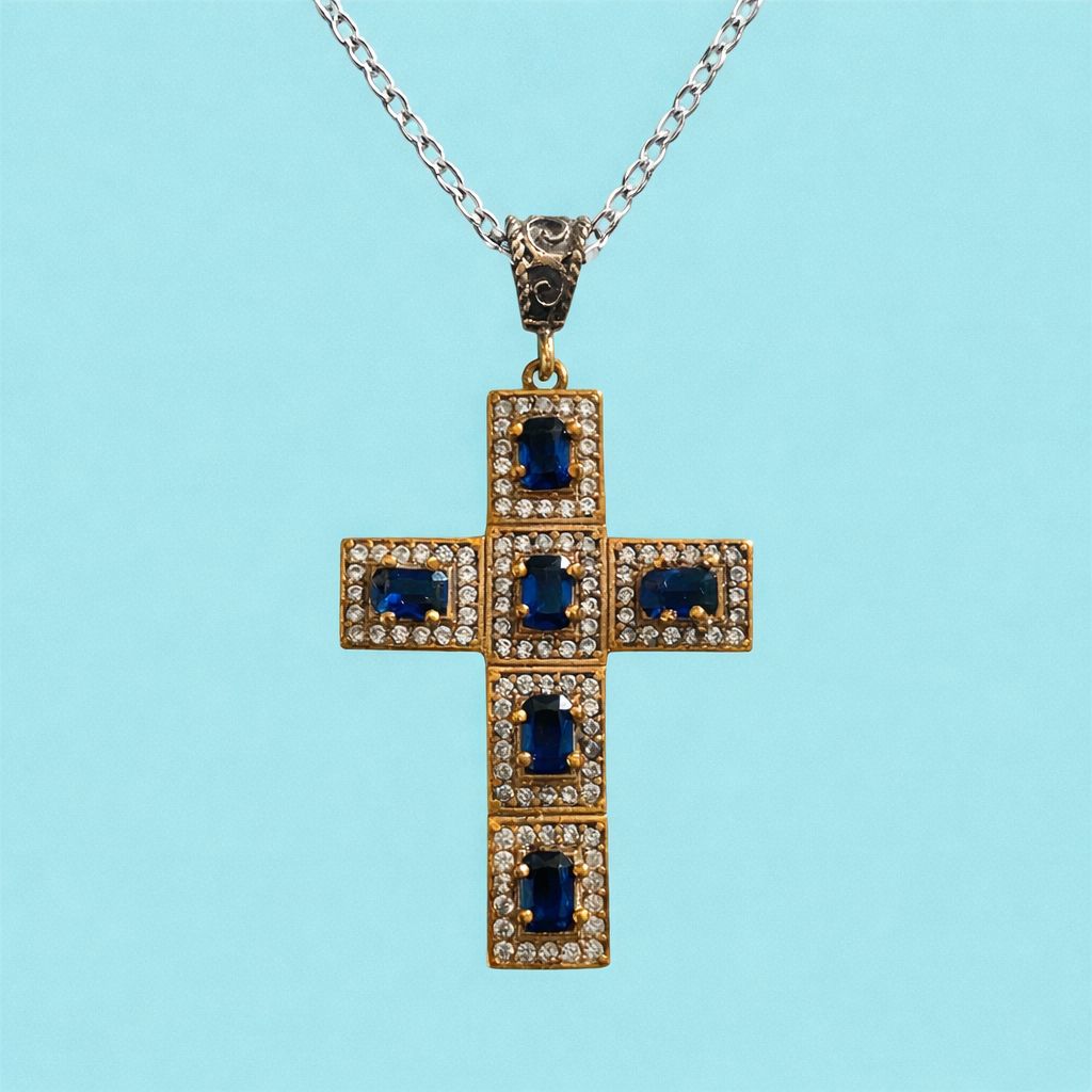 Colgante de plata 925 de gran tamaño. (5 cm*3cm) con forma de cruz, engastado con piedras azul zafiro en corte rectangular rodeada por un marco de circonitas blancas que realzan su intensidad. De inspiración clásica y presencia imponente, Cruz Imperial es una joya que transmite fuerza, elegancia y un aire majestuoso en cada detalle