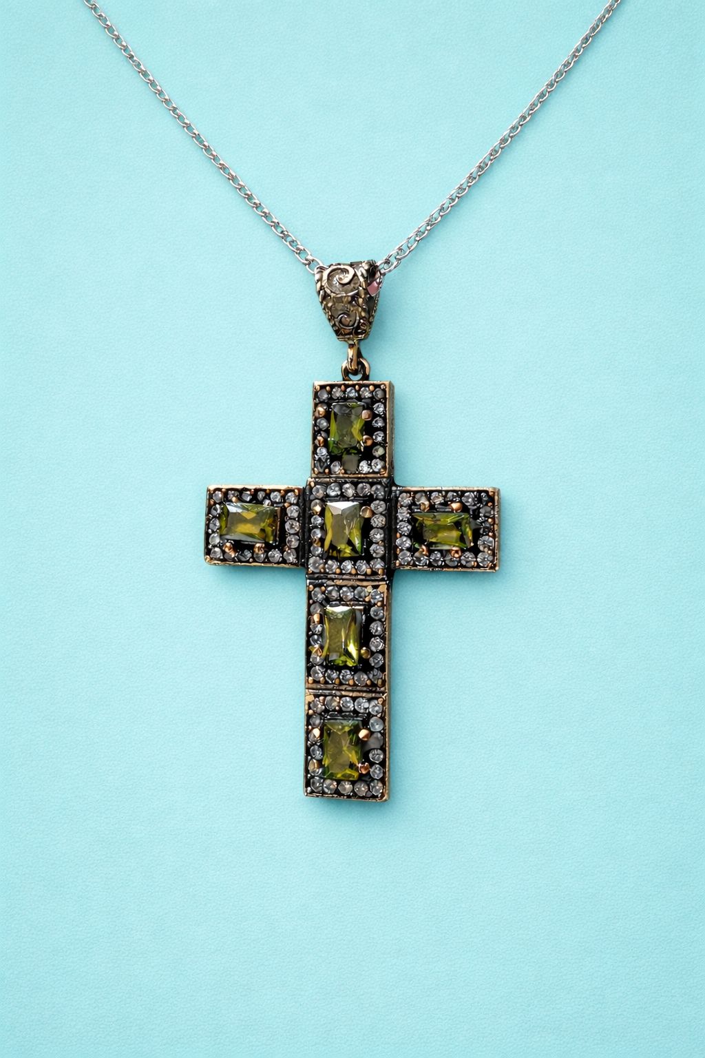Colgante de plata 925 de gran tamaño. (5 cm*3cm) con forma de cruz, engastado con piedras verde oliva en corte rectangular rodeada por un marco de circonitas blancas que realzan su intensidad. De inspiración clásica y presencia imponente, Cruz Imperial es una joya que transmite fuerza, elegancia y un aire majestuoso en cada detalle