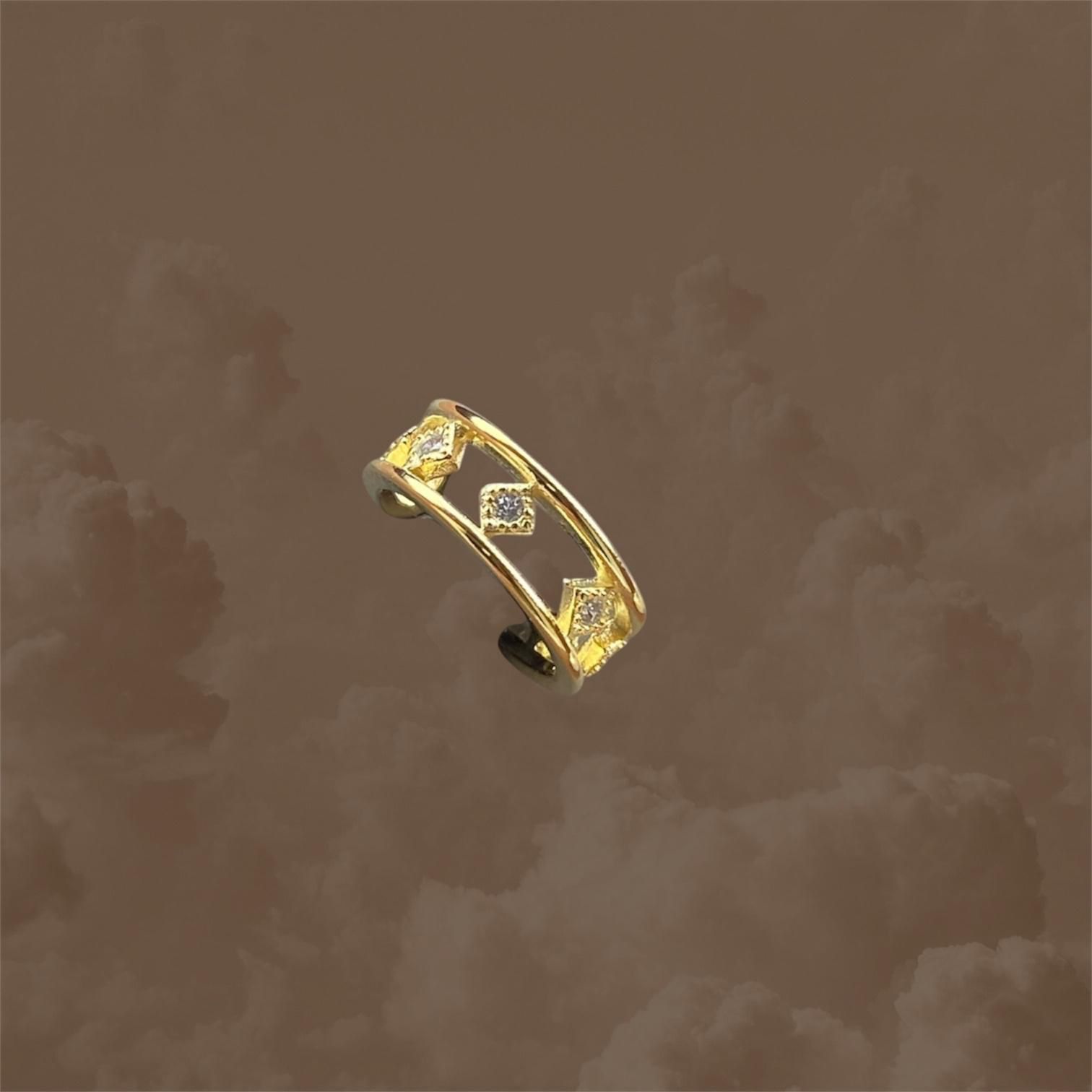 El ear cuff Atlas está realizado en plata con baño de oro y presenta un diseño arquitectónico; estructura abierta con pequeños rombos calados, cada uno engastado con circonitas blancas. Su equilibrio entre geometría y brillo lo convierte en una pieza versátil y sofisticada, perfecta para añadir carácter a cualquier combinación de pendientes