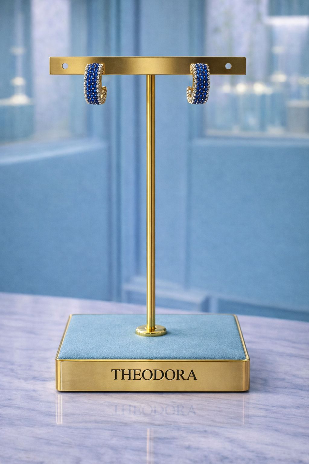 Aros medianos cubiertos de circonitas azul profundo, como un reflejo del cielo a medianoche. Su diseño compacto y elegante los convierte en el complemento perfecto para realzar cualquier estilismo con un toque de misterio y sofisticación. Una joya que captura la magia de la noche con cada destello