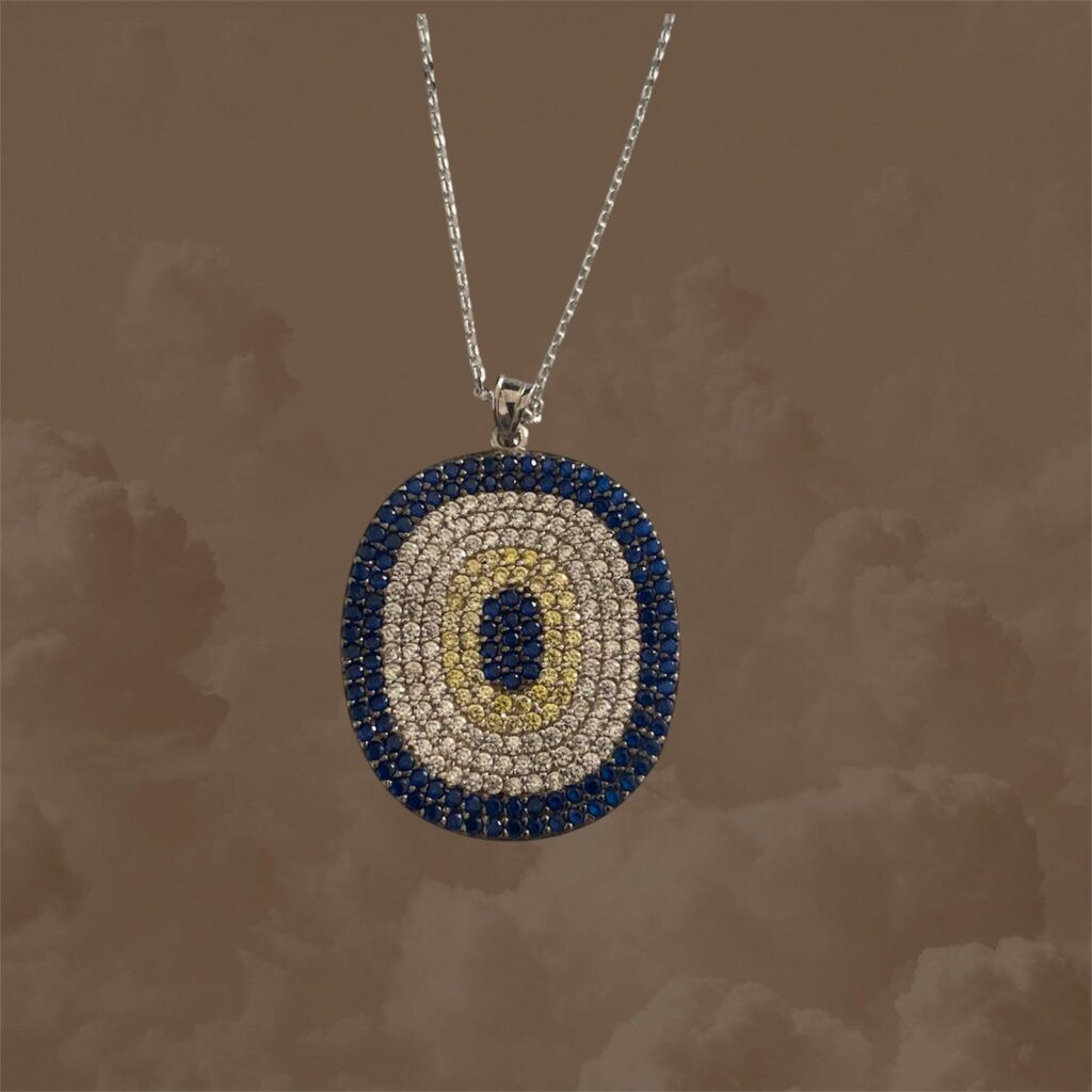 Colgante de forma ovalada con un diseño hipnótico en tonos zafiro, dorado y cristal.