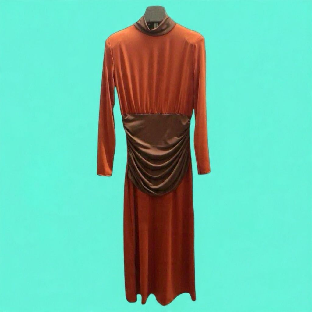 Vestido Ariadna en punto fluido bicolor, con cuerpo en tono teja profundo y fajín drapeado en naranja caldero que realza la silueta. Cuello alto estructurado y manga larga para una elegancia contemporanea . Ideal para eventos de noche donde el color y el diseño hablan por si solo